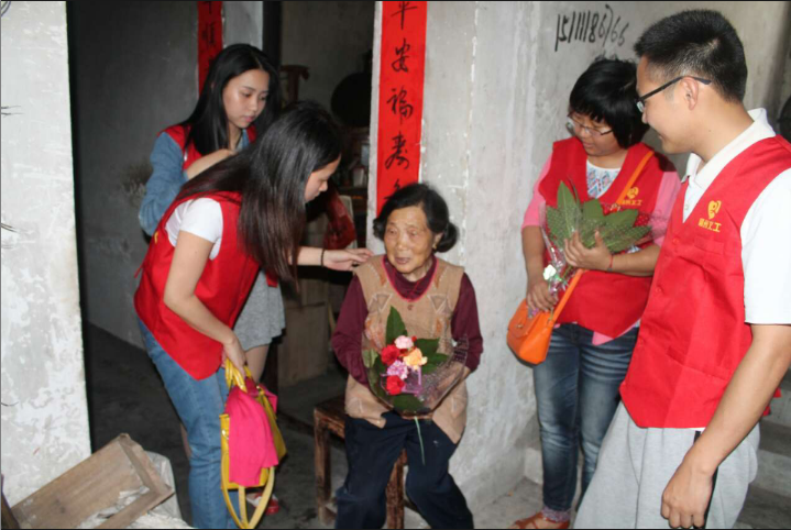 (志愿者与84岁高龄的陈奶奶聊家常,并祝福她健康长寿)