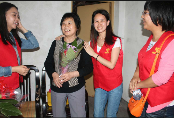 (志愿者为秦奶奶献上鲜花,表达美好的祝福)