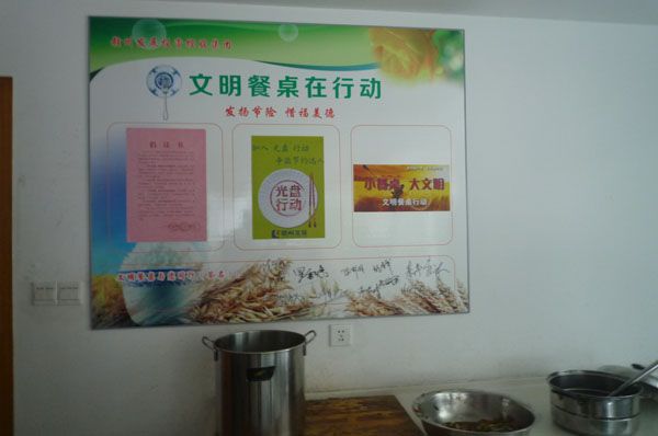 (员工餐厅内张贴了“文明餐桌”宣传牌)