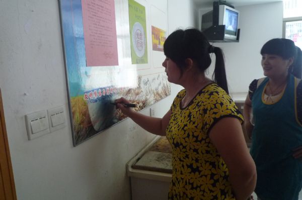 (广大干部职工纷纷在“文明餐桌”宣传牌上郑重地签上自己的名字)