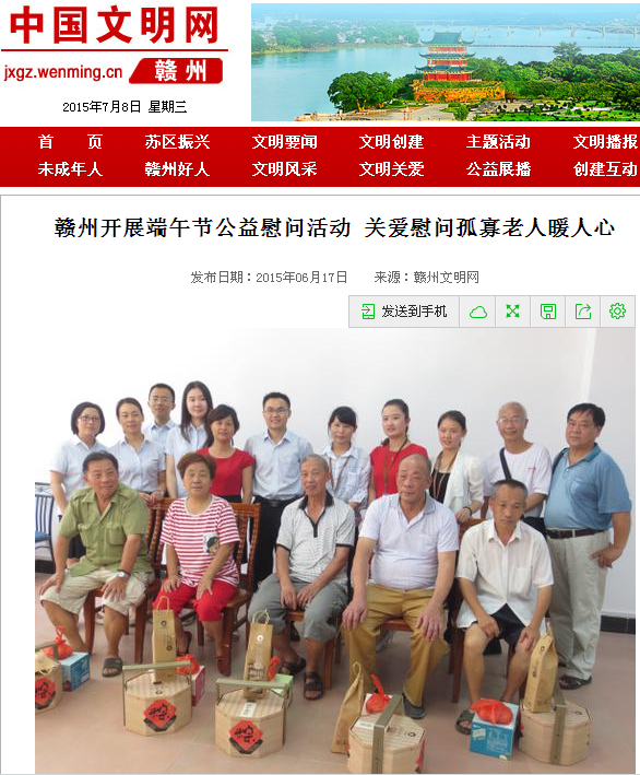 2015年6月17日,中国文明网图文刊发了《赣州开展端午节公益慰问活动 关爱慰问孤寡老人暖人心》新闻,报道必赢242net官网开展端午节公益慰问活动。