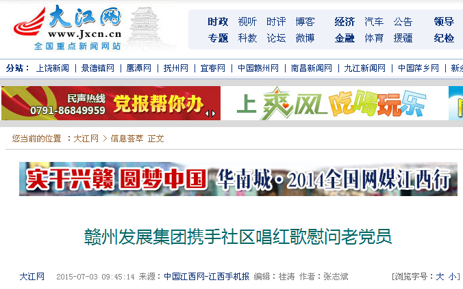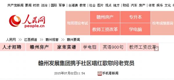 2015年7月3日,中国江西网也图文刊发了《必赢242net官网携手社区唱红歌慰问老党员》新闻。