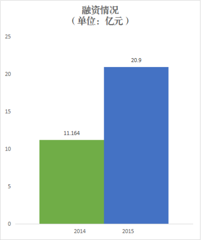 2015年,实现融资20.9亿元,同比增长87%。