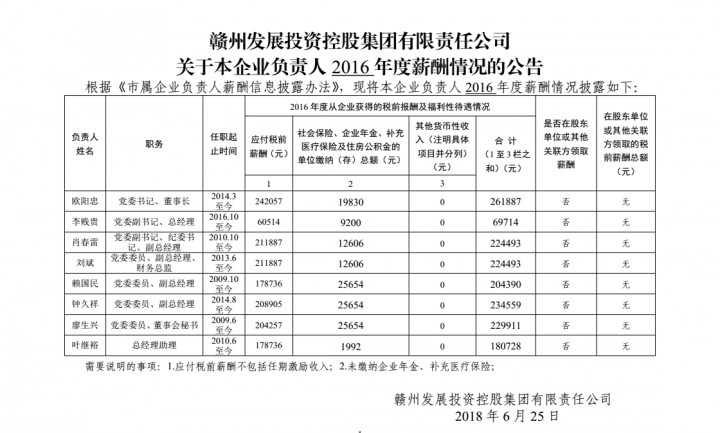 关于本企业负责人2016年度薪酬情况的公告