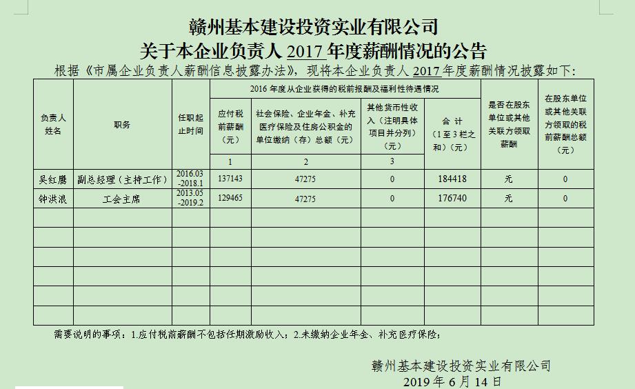 赣州基本建设投资实业有限公司 关于本企业负责人2017年度薪酬情况的公告