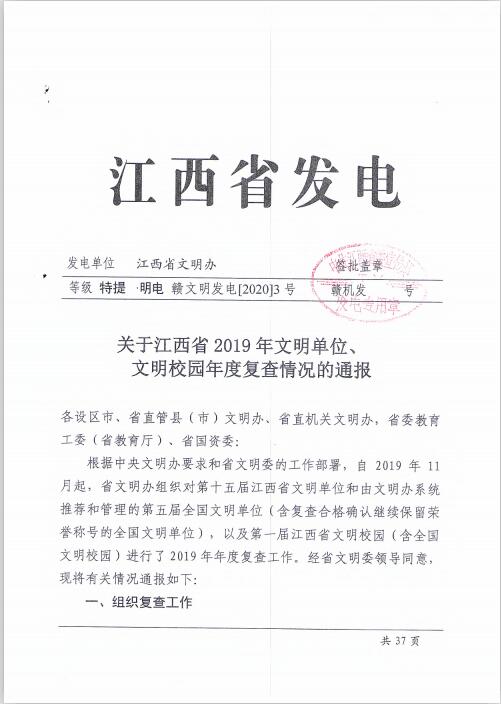 近日,江西省文明办发布《关于江西省2019年文明单位、文明校园年度复查情况的通报》,集团顺利通过2019年省级文明单位年度复查。
