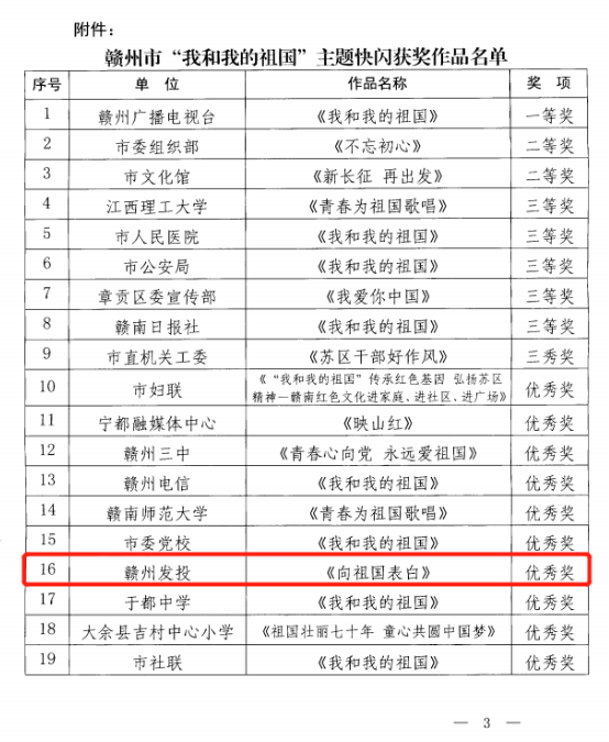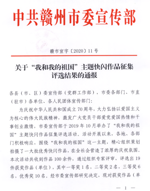 4月7日,中共赣州市委宣传部印发《关于“我和我的祖国”主题快闪作品征集评选结果的通报》,集团选送的作品《向祖国表白》,从100余件作中脱颖而出,荣获“优秀奖”。