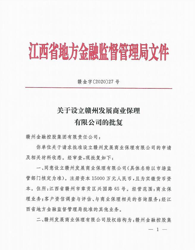 日前,江西省地方金融监督管理局下发《关于设立赣州发展商业保理有限公司的批复》文件,同意赣州金融控股集团设立注册资本金1.5亿元的赣州发展商业保理有限公司。