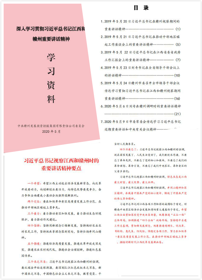 通过收录习近平总书记在推动中部地区崛起工作座谈会上的重要讲话精神、习近平总书记在江西省委省政府工作汇报会上的重要讲话、习近平总书记在赣州视察期间的重要讲话精神等学习内容,让集团全体干部职工把学习汇编资料作为案头书、必读书,学深学透、入脑入心。