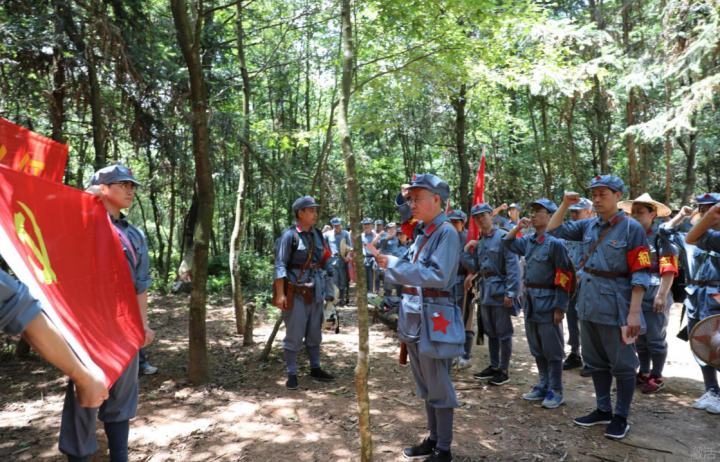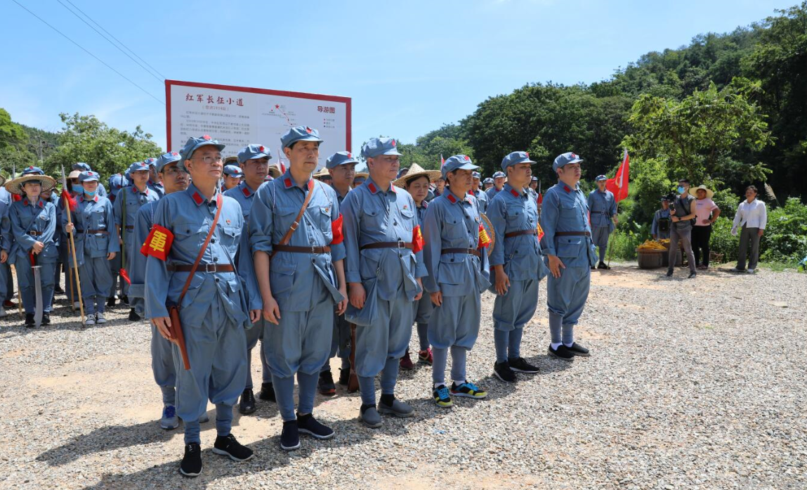 为再现当年峥嵘岁月,集团全体党员被整编为“红军”,大家身穿红军服,戴上红军帽,扛旗帜、背长枪、带大刀,个个精神抖擞,在于都祁禄山镇金沙村整队集合。这种特殊的“情景再现”,体现了互动性、参与性、融入性,让一段段红色记忆“活”了起来。
