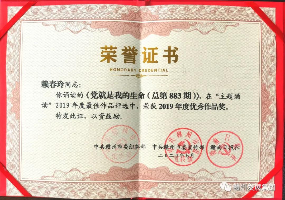 赣州发展融资租赁公司党支部选送“主题诵读”作品荣获全市“年度优秀作品奖”