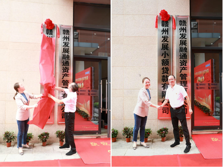 市金融办副主任杨蕙宇与集团党委书记、董事长李贱贵共同为赣州发展小额贷款有限公司揭牌。