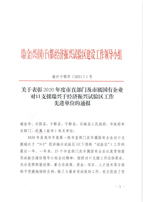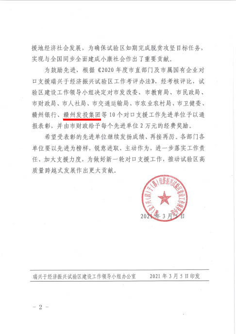 3月5日,瑞兴于经济振兴试验区建设工作领导小组对2020年度市直部门及市属国有企业对口支援“瑞兴于”经济振兴试验区先进单位予以通报表彰,赣州发投集团荣列榜中。赣州发投集团2019年度、2020年度连续两年获此殊荣。