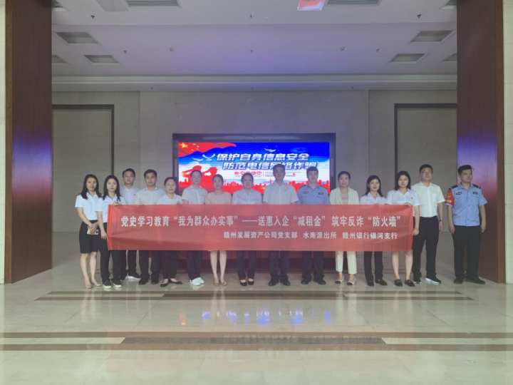 为扎实开展党史学习教育“我为群众办实事”实践活动,切实为群众办实事解难题,根据江西省人民政府《关于减税减费减租减息减支32条政策措施的通知》(赣府发〔2021〕8号)及赣州市国资委《关于认真贯彻落实省政府减税减费减租减息减支32条政策措施的通知》(赣市国资字〔2021〕11号)文件精神,5月14日,必赢242net官网旗下资产公司党支部创新党史学习教育“我为群众办实事”实践活动形式,在宣传免租政策的同时,结合当下反诈骗宣传热点,联合水南派出所、赣州银行银河支行开展党史学习教育“我为群众办实事”——送惠入企“减租金”,筑牢反诈“防火墙”主题活动。