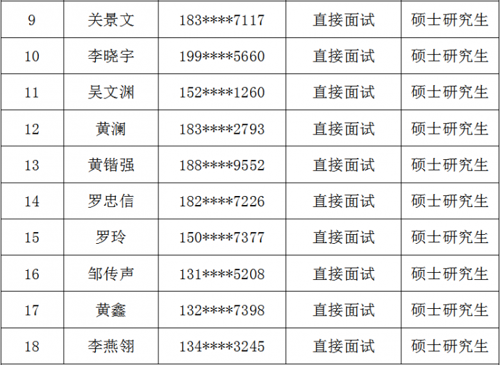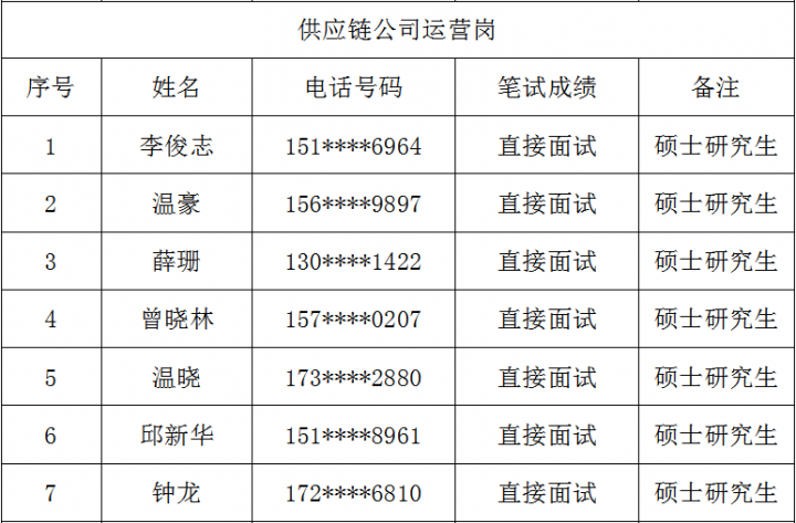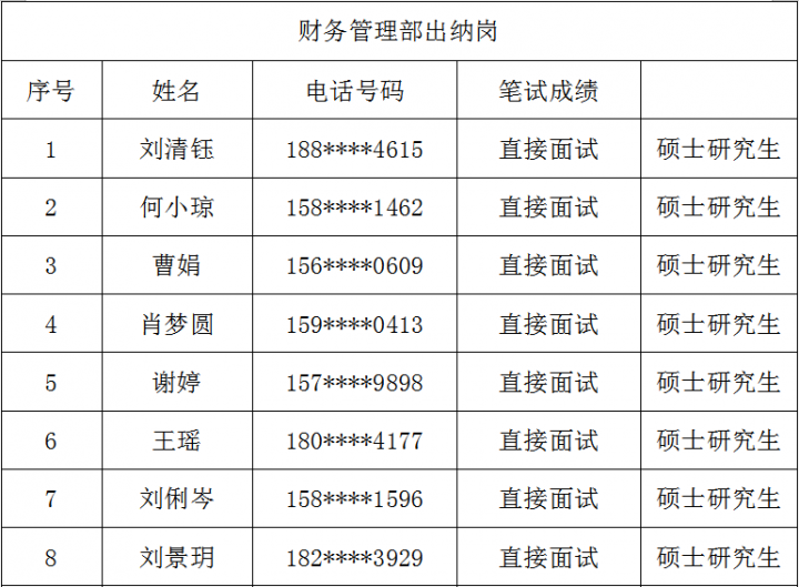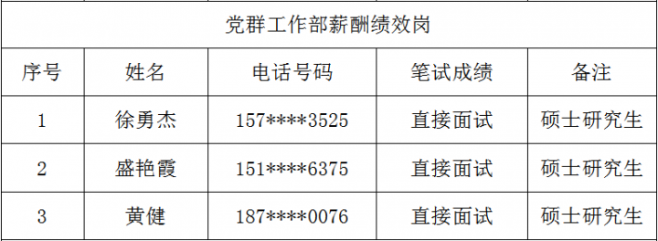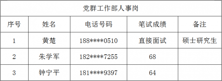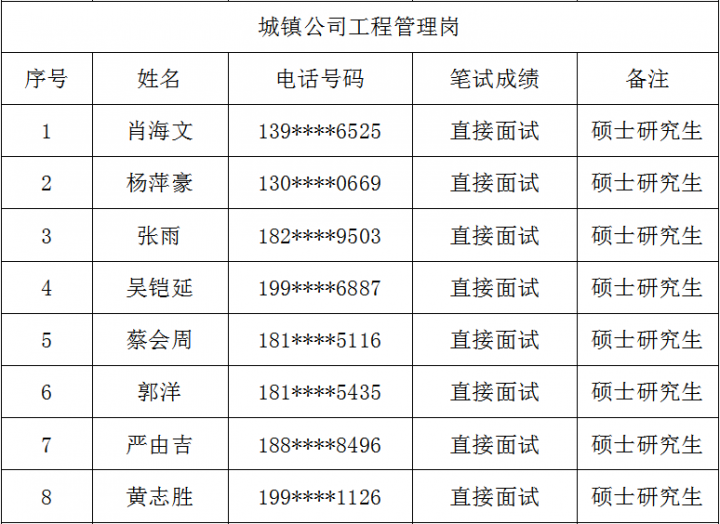 根据《赣州发展投资控股集团应届毕业生招聘公告》规定的程序,经简历初审、资格审查、笔试环节,根据《招聘公告》,笔试成绩合格线为60分,未达到60分的,不可进入面试;硕士研究生免笔试,直接进入面试。现将参加面试人员名单公告如下:(同时公布面试有关事项):