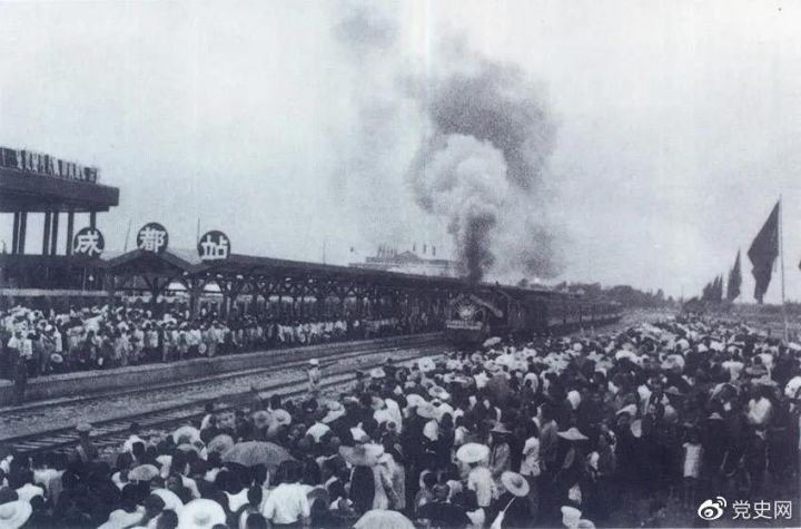 新中国成立后,在短短的两年内就建成了成渝铁路。图为1952年7月1日由成都开出的第一列火车。