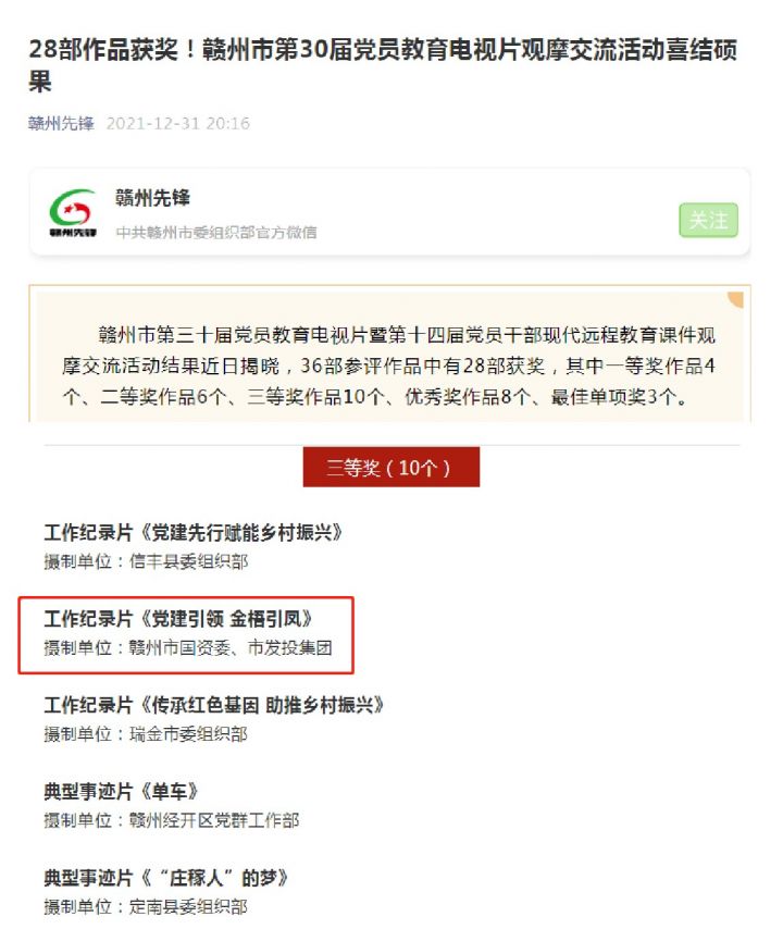据悉,作为市属国有企业唯一获奖短片,《党建引领金梧引凤》讲述了集团自2018年整合重组至今,坚持党建引领与改革创新双轮驱动,发起设立赣州金控集团,创建“金梧桐”党建品牌,推动党建工作与经营业务深度融合,引育优质产业项目,助力我市经济高质量发展的故事,该片获奖是对集团党建工作的充分肯定。