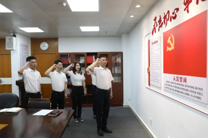 面向鲜红的党旗,黄强右手握拳高举过肩,带领4名新发展预备党员和各党支部党员代表庄严宣誓:“我志愿加入中国共产党,拥护党的纲领……随时准备为党和人民牺牲一切,永不叛党。”铿锵有力的誓言,在党员活动室内激昂回荡。