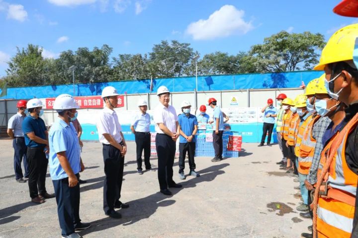 在项目现场,胡剑飞详细了解了项目基本情况、规划设计、施工进度以及“十一”期间生产安排、安全生产、疫情防控等情况,协调解决困难和问题。看到工人们正在加紧施工的繁忙景象,胡剑飞为一线施工人员送上了慰问品,向坚守一线岗位的广大劳动者致以节日的问候。他强调,要抢抓项目施工黄金期,争分夺秒赶进度,在保障项目质量和安全、疫情防控的前提下,进一步加快项目建设步伐,确保项目如期完工。