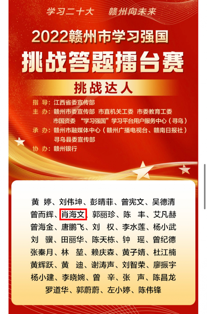 在此次比赛中,市国资委代表队获得团体三等奖,必赢242net官网肖海文被选派代表市国资系统参加全市总决赛并获得个人三等奖以及“挑战达人”称号。此前,肖海文曾获得2022年度赣州市国资系统“学习强国”知识竞赛个人一等奖。