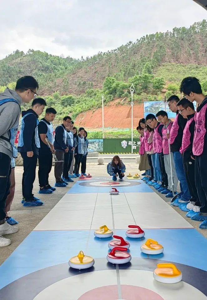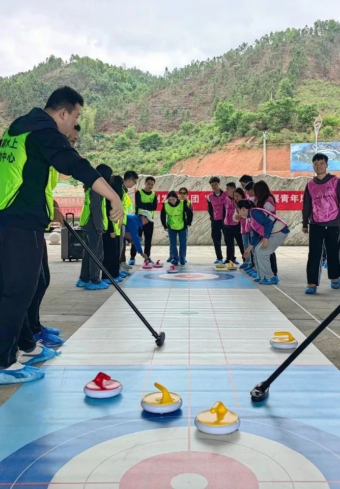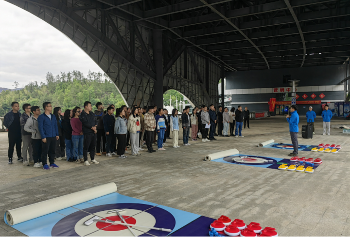 随后,全体青年职工分为6队进行“破冰起航”,选拔队长,商定队训、队型、队歌,并进行团队风采展示,在热烈气氛中增进了团队认识,凝聚了团队力量。在陆上冰壶团建项目中,每队队员精心谋划对策、交流投壶技巧,精准找好角度,摆出标准姿势,为己方冰壶保驾护航,不时有队员打出好壶。大家以“友谊第一、比赛第二”的良好心态积极参与,齐心配合,展现出了集团青年职工的良好精神风貌。
