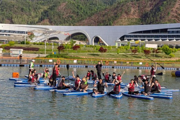 活动最后环节,开展了水上浆板团建项目,基地教练带领大家着重训练了水上安全救生能力和应急协调能力,大家通过学习水上浆板基本操控,锻炼了身体平衡性和反应敏捷性,活动氛围紧张而又热烈,团队默契得到进一步提升。
