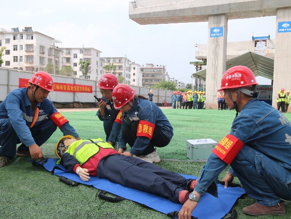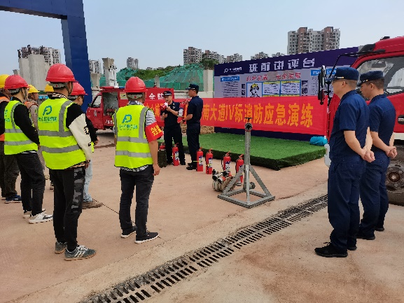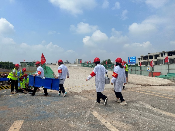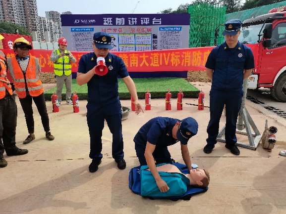 赣州市中心城区快速路工程—赣南大道Ⅲ标、赣南大道Ⅳ标蓉江段、东江源大道快速化改造工程项目现场根据快速路施工特点和潜在的各类风险隐患,有针对性地分别开展了快速路施工高处坠落、物体打击、高温中暑等事故应急救援和消防应急演练活动,并邀请了赣州市消防救援大队教官和人民医院医护人员进行现场急救教学。