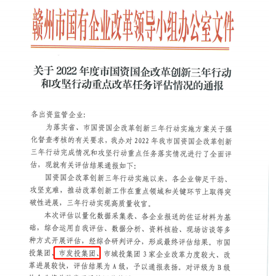 近日,赣州市国有企业改革领导小组办公室对在2022年我市国资国企改革创新三年行动完成情况和攻坚行动重点任务落实工作中改革力度较大、改革进展较快的市属国有企业进行了表彰,其中,赣州发投集团榜上有名,获得2022年度市国资国企改革创新三年行动和攻坚行动重点改革任务评估为A级。这是赣州发投集团继2021年获市国资国企改革创新三年行动重点改革任务评估为A级之后,再次获此殊荣。