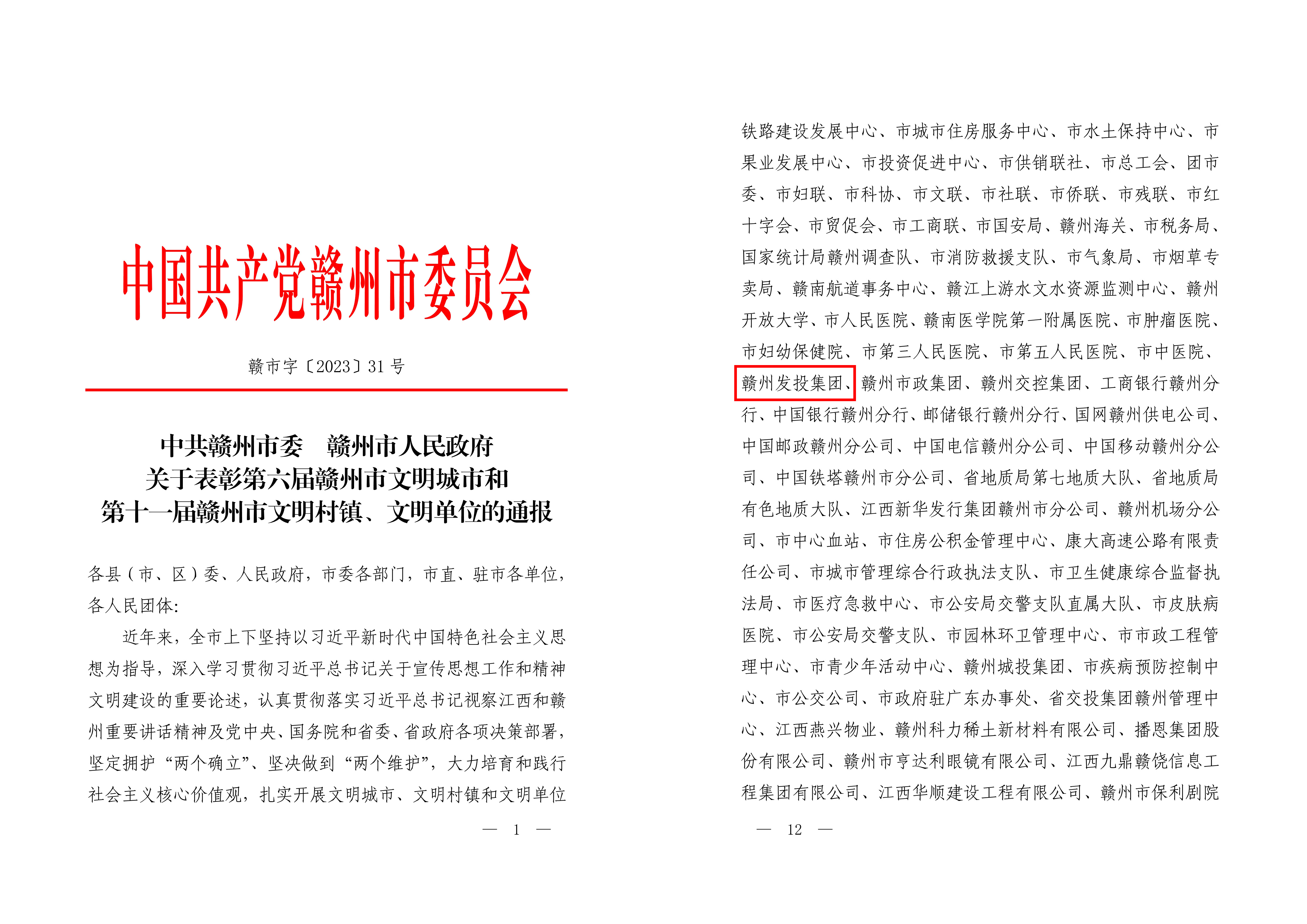 喜讯!赣州发投集团获评“赣州市第十一届文明单位”