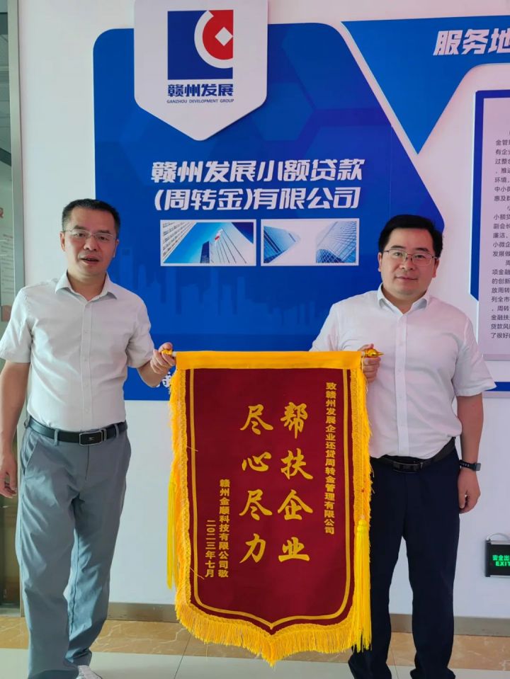 8月11日,赣州金顺科技有限公司送来一面写有“帮扶企业 尽心尽力”的锦旗,对赣州发展企业还贷周转金管理有限公司以专业、周到的服务为企业解决融资难题表示衷心的感谢。