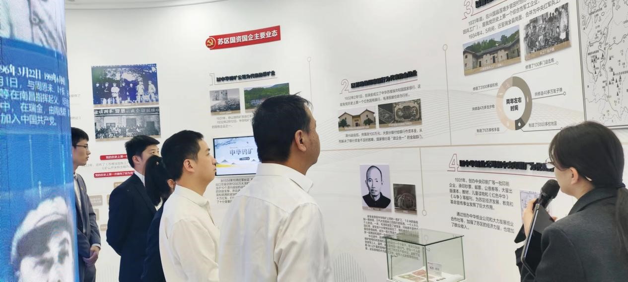 在国资国企党建馆,大家集中学习了习近平总书记关于国资国企改革发展和党的建设重要论述,随后在讲解员引导下依次参观了“牢记领袖嘱托、传承红色基因”“追根溯源、不忘初心”“固本强基、党建引领”“融合赋能、感恩奋进”“建功新时代、开启新征程”等五个篇章。通过图文视频、声光电、幻影成像等形式多样的现代化表现手法,让全体参观人员更直观真切地感受了苏区国资国企的光荣历史,接受了一次深刻的党性教育,进一步坚定了理想信念。