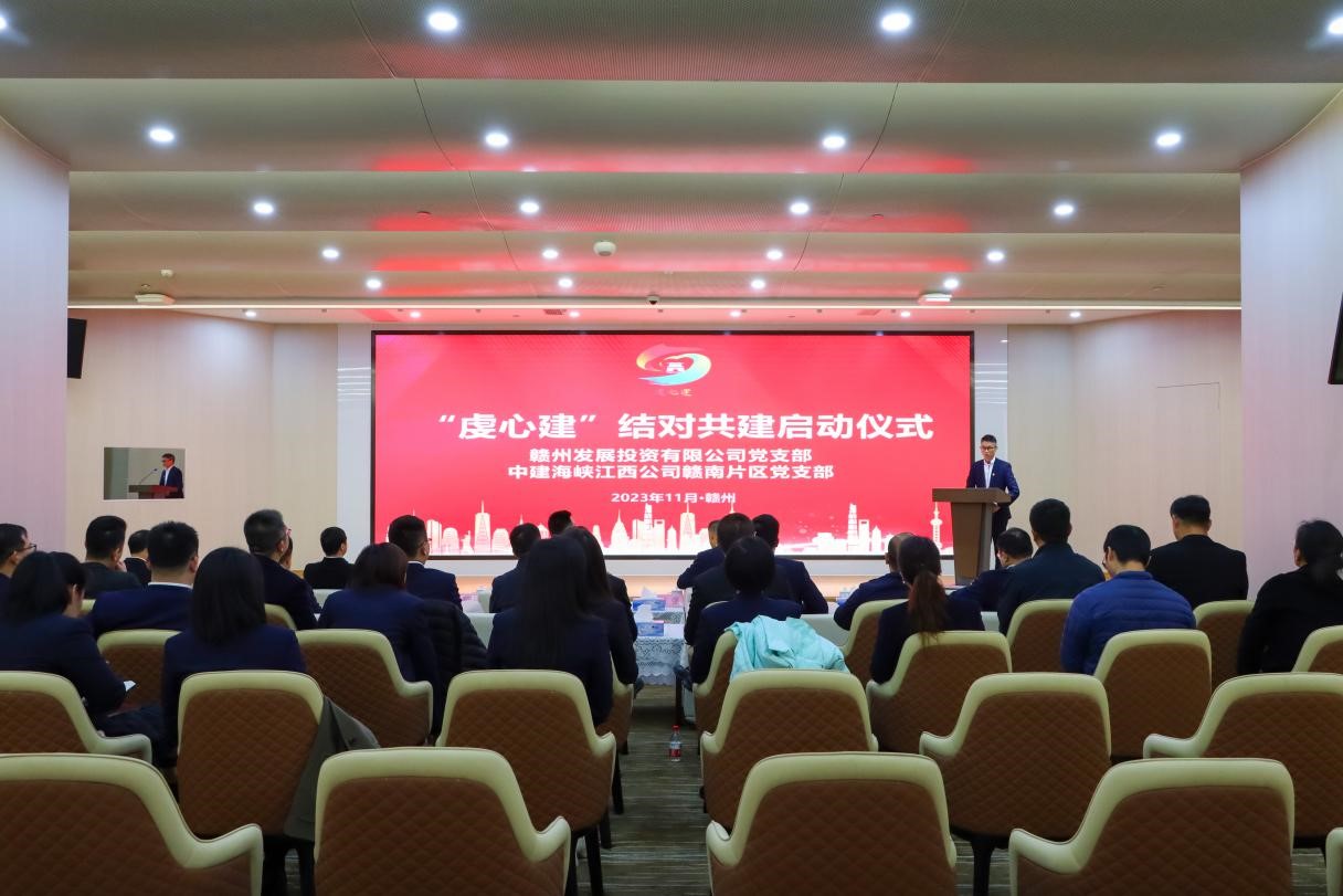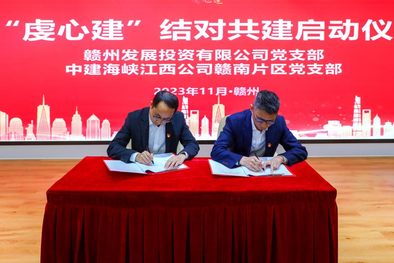 启动仪式上,赣州发展投资公司党支部书记张贵诗介绍“虔心建”党建品牌及结对共建清单,中建海峡赣南发展中心党支部书记曾志雄承诺积极践行好双方拟定的共建项目清单,树立央地合作的党建共建典范。与会党员共同观看双方企业宣传片,双方党支部书记共同签署《“虔心建”党建结对共建框架协议书》。