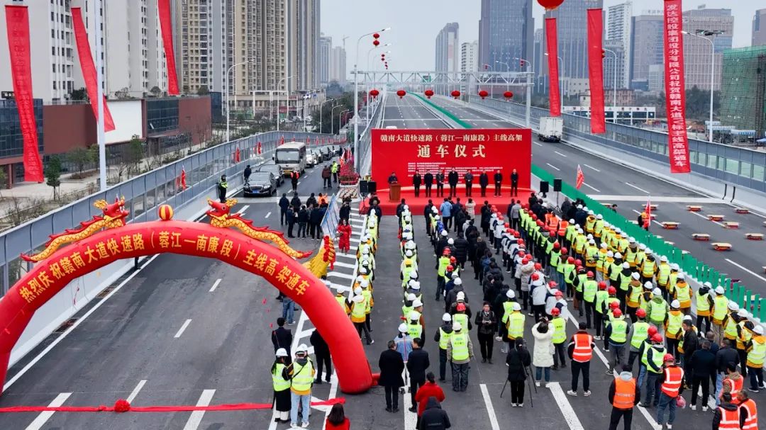 赣南大道快速路(蓉江-南康段)是中心城区二期快速路的子项目,西起南康区康东大桥东侧,东至新世纪大桥西侧引桥,途径南康、蓉江新区,总投资63.55亿元,全长20.3公里(高架段长17.97公里,地面段长2.33公里),双向6车道,整个路段上跨大广高速,下穿赣深高铁,有三处立交衔接,九对上下匝道,是城区二期七条快速路自主筹集建设最大、里程最长、施工最复杂的项目,也是建设进展最快的高架路,2022年2月开工,仅23个月即实现主线高架通车,提前计划工期一年。项目顺利通车,对提升城市功能品质、优化营商环境、增强中心城区辐射带动力具有重要意义。