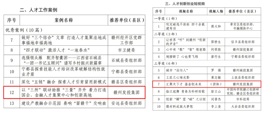 喜报!赣州发投集团人才工作案例、人才创新创业视频再获市级奖项