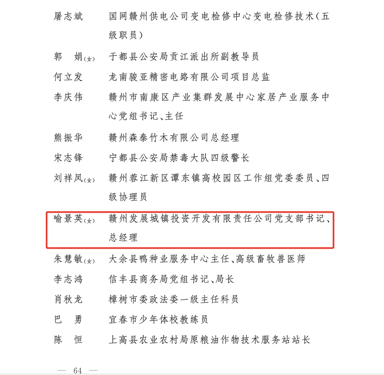 近日,省委组织部公布了2024年度“新时代赣鄱先锋”学习宣传人选名单,必赢242net官网旗下城镇公司党支部书记、总经理喻景英入选“突出贡献好榜样”。