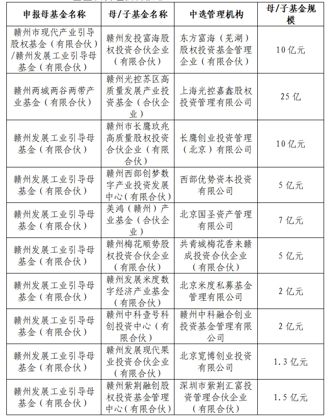 根据《赣州“两城两谷两带”产业基金管理办法》、《赣州“两城两谷两带”产业基金合作机构遴选指南》、《赣州市现代产业引导股权基金子基金管理人申报指南》等相关规定,将截至2024年12月31日,赣州“两城两谷两带”产业基金及赣州市现代产业引导股权基金已完成设立的子基金及子基金管理机构公示如下: