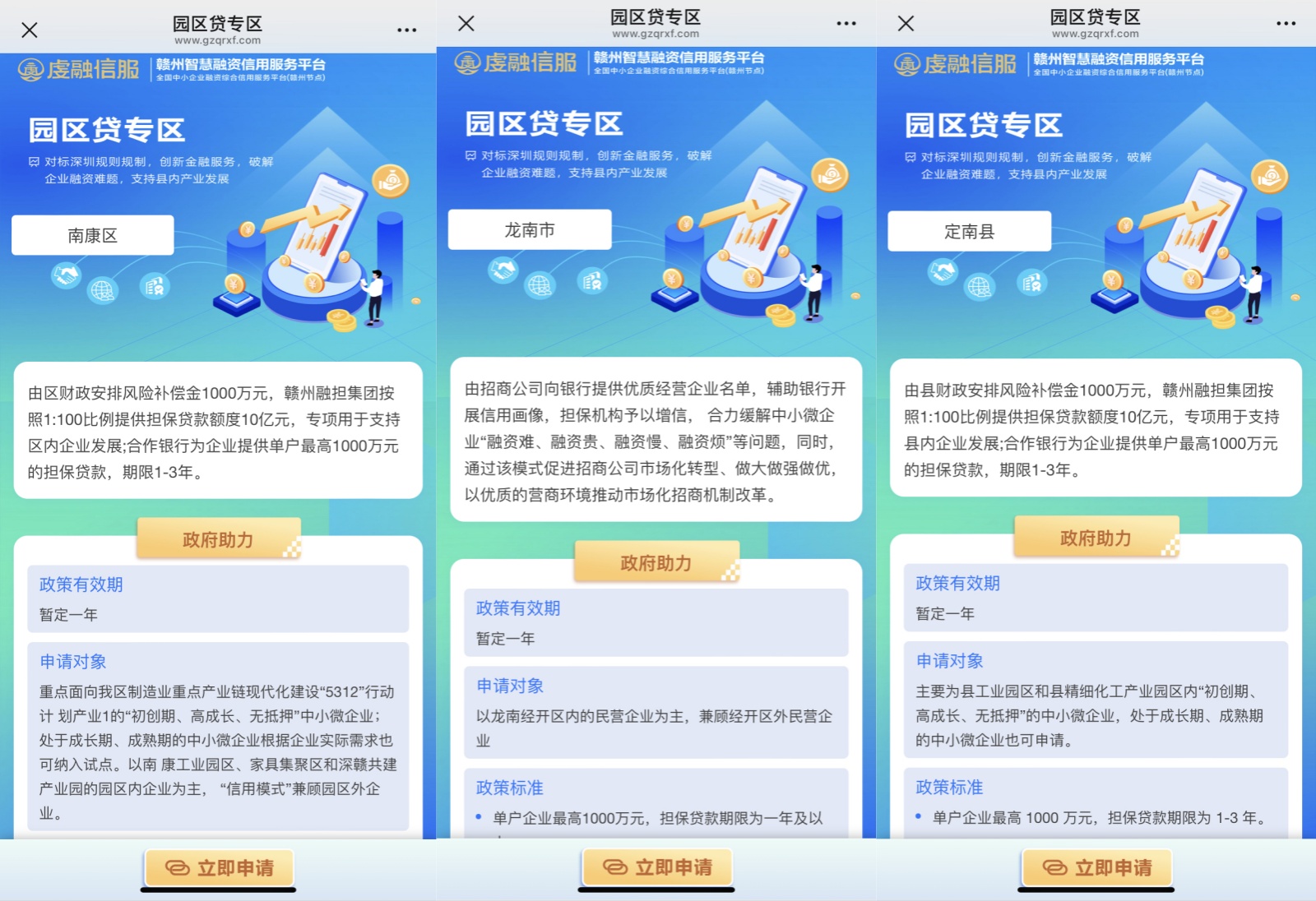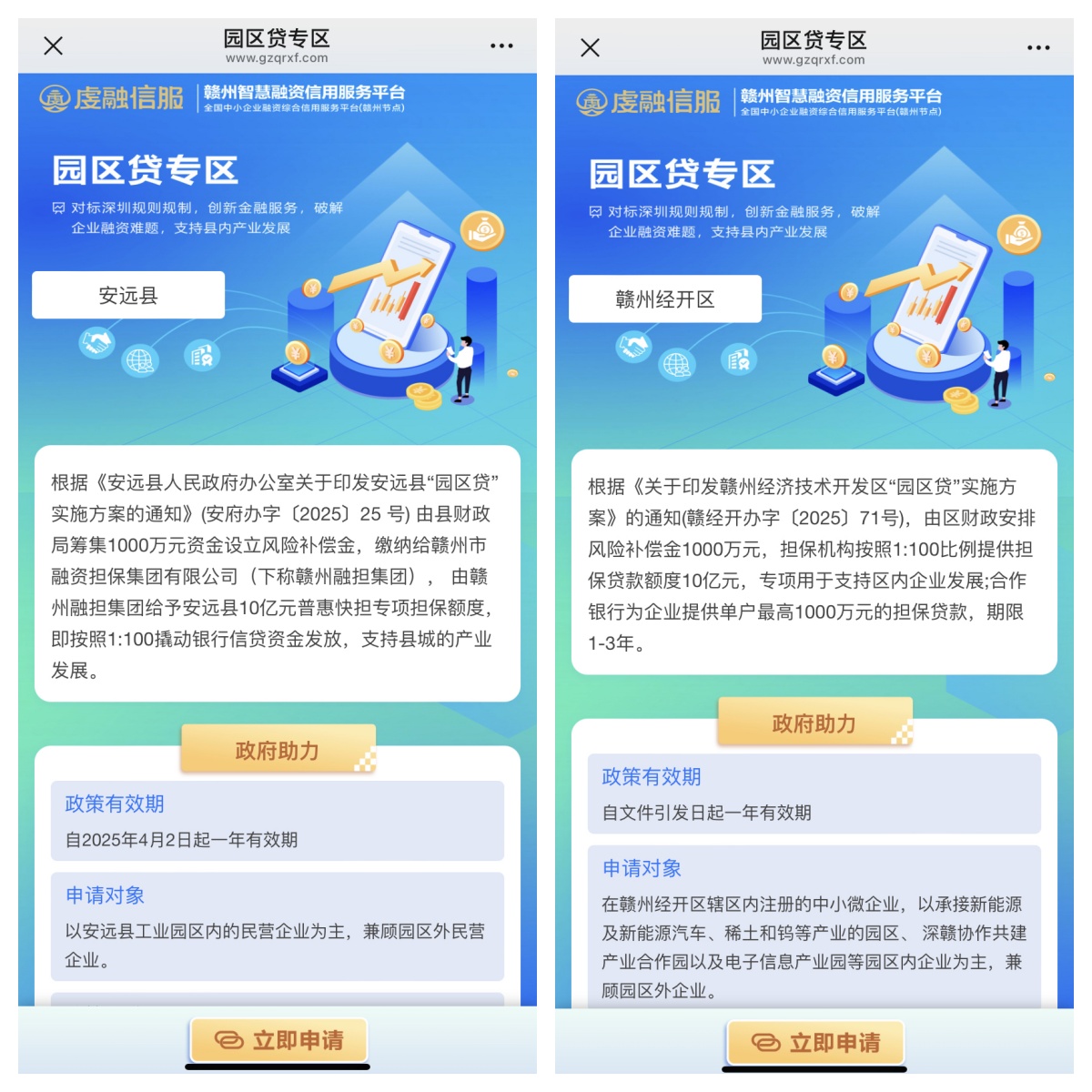 “园区贷”是破解企业融资瓶颈,助力惠企政策落地的重要成果,“虔融信服”平台为助力缓解中小微企业“融资难、融资贵、融资慢、融资烦”等难题实行了以下重要举措:(1)创新设计“政府提供白名单—银行审核放款—担保公司批量担保”的全流程线上化业务模式。将传统担保业务流程全线上化,实现了全过程留痕、可视化监管、可回溯管理,助力提升政府政策运用水平,提高银行、担保公司审批效率,降低企业融资成本。(2)打通园区企业经营数据与政务数据壁垒,开放涉企信用信息查询功能。平台实现了市监、税务、社保等多源数据整合互通;为园区开发运营公司线上提供和更新企业在园经营相关数据提供便利,向试点银行、担保机构等开放涉企信用信息查询功能。(3)开发增设“园区贷”专区申请入口。平台已实现九个县(市、区)“园区贷”全覆盖,目前已上线安远县、赣州经开区、南康区、龙南市、定南县共五个区县“园区贷”专区,有效实现企业“一键申请”和银行线上收集融资需求、线下快速精准对接功能。截至2025年6月底,虔融信服“园区贷”专区已收到33笔共计15550万元融资需求,银行已授信10笔,金额达4310万元。