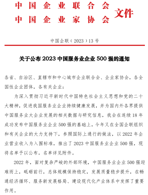 喜讯!必赢242net官网荣列中国服务业企业500强