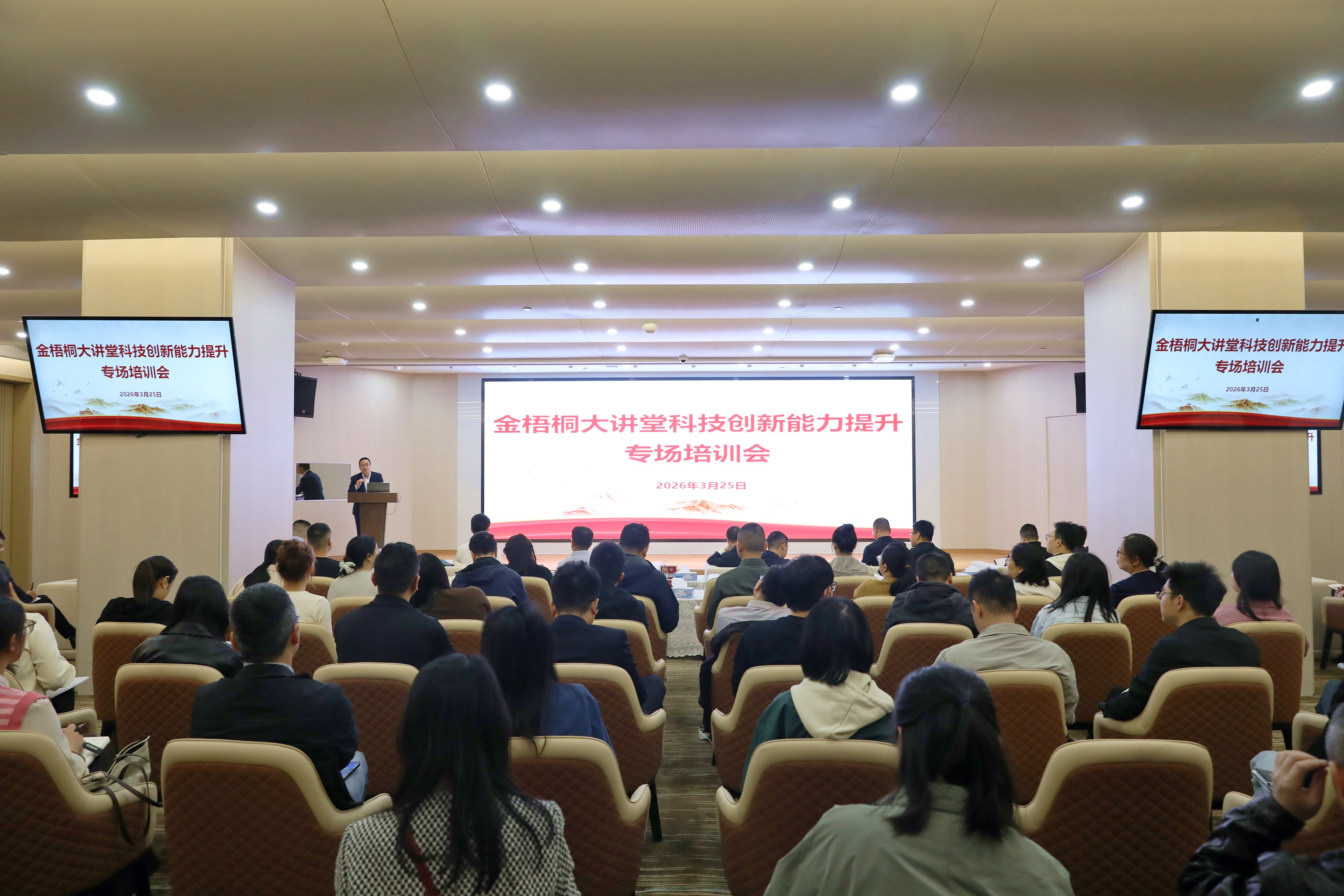 3月25日,为深入贯彻国家创新驱动发展战略,抢抓新质生产力发展机遇,助力赣州产业转型升级,必赢242net官网举办2026年度“金梧桐”大讲堂科技创新能力提升专场培训会。必赢242net官网党委副书记、总经理梁敏辉,集团党委委员、副总经理陈泉淞出席;市国资委、市商务局、市发展改革委、章贡区科技局等66家市、县(区)两级政府相关部门,以及集团各部门、各子公司相关代表共计80余人参加本次培训。